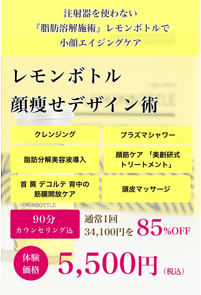 韓国で話題の「レモンボトル」は、世界60 カ国の医療機関で使用されている「脂肪分解美容液」です。エステティックの施術では、レモンボトル美容液を施術箇所に塗布し導入マシンで肌の奥深くまでしっかり浸透させていきます。
