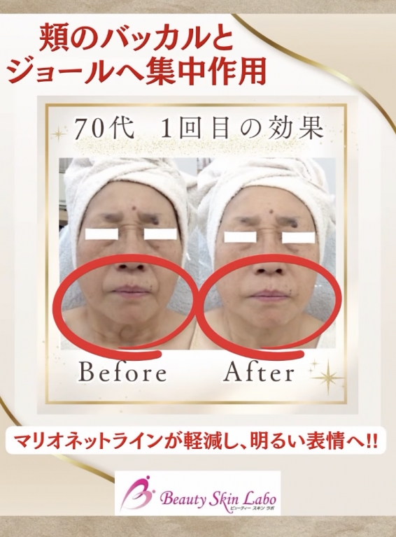 〈 🍋レモンボトル施術症例🍋 〉 70代 1回目の効果▶︎頬のバッカルとジョールへ集中作用╔════════════╗ マリオネットラインが 軽減し、明るい表情へ😃╚════════════╝ビューティースキンラボ